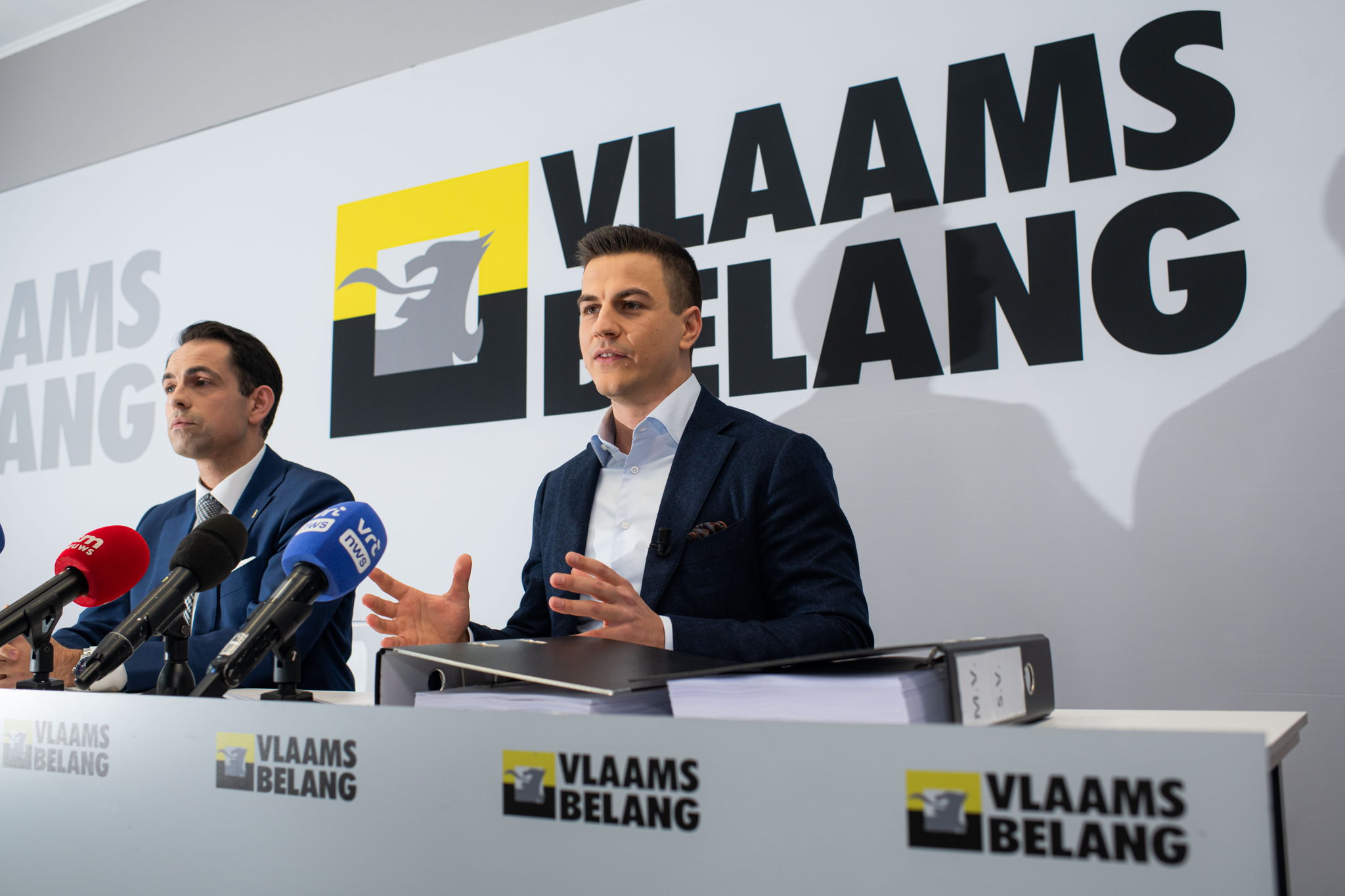 #FlandersNewsService | Dries Van Langenhove (right) during a lecture by Dutch politician Thierry Baudet in Ghent in October 2023 © BELGA PHOTO JAMES ARTHUR GEKIERE