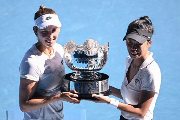 Elise Mertens and Hsieh Su-wei celebrate after their victory in the women's doubles final © PHOTO ANTHONY WALLACE / AFP