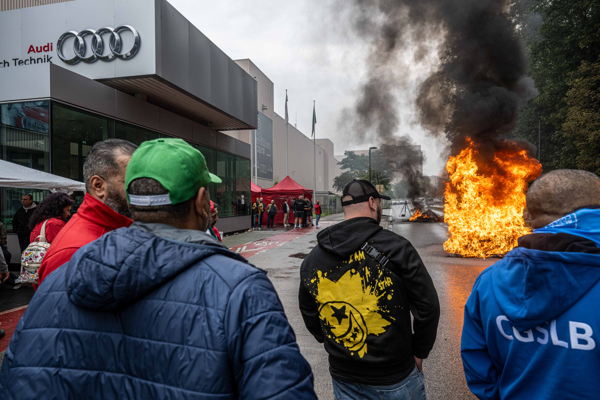 Workers at the closed Audi Brussels plant in Forest, March 2025 © PHOTO GABRIEL PACHECO / HANS LUCAS VIA AFP