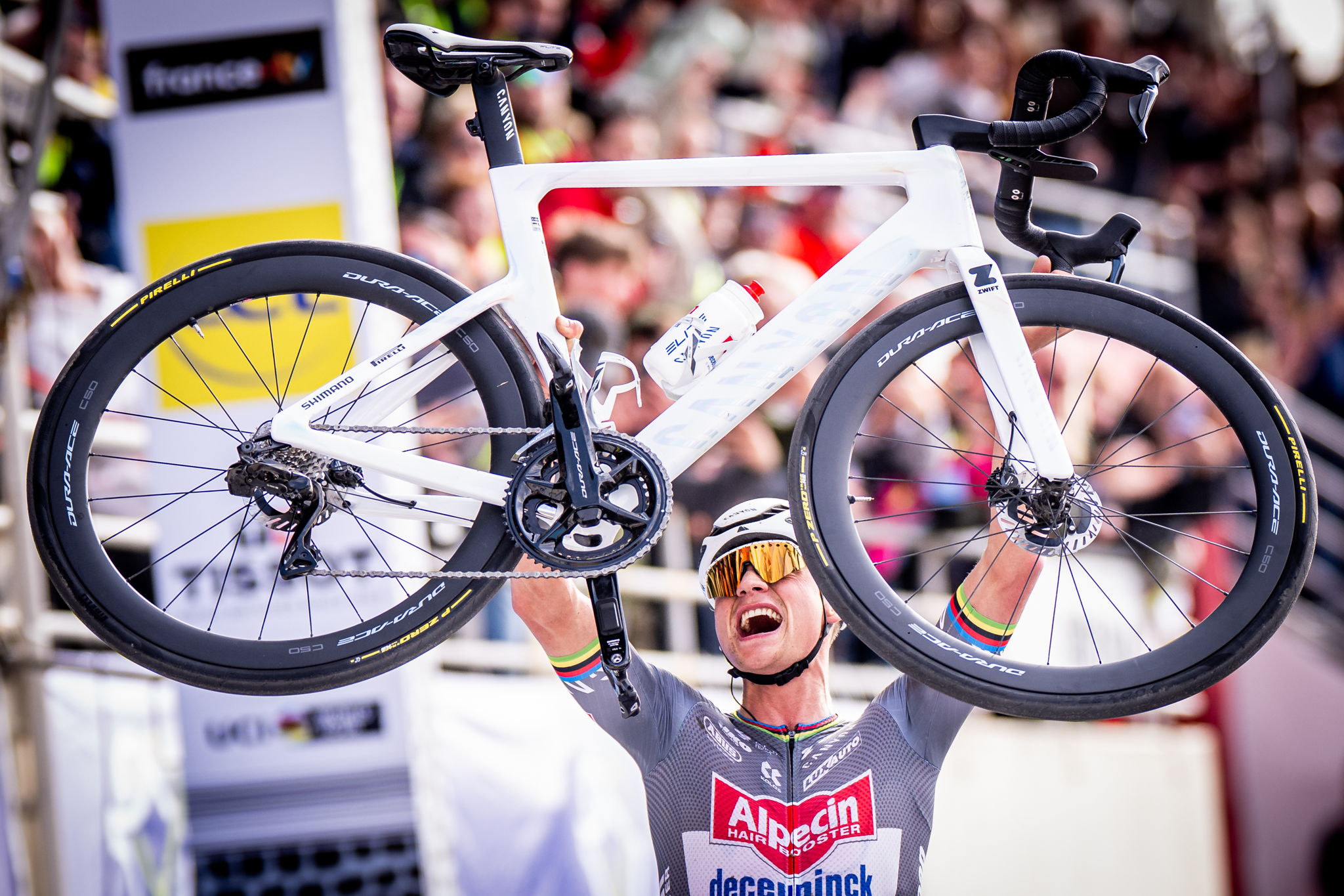 Van der Poel, who was hit with 32km to go, called for legal action. "This can't go unpunished. It was a full bottle - it really hurt. If it had hit my nose it would've been broken. This should be prosecuted. It's attempted manslaughter. If the UCI doesn't take action, our team could pursue it.
