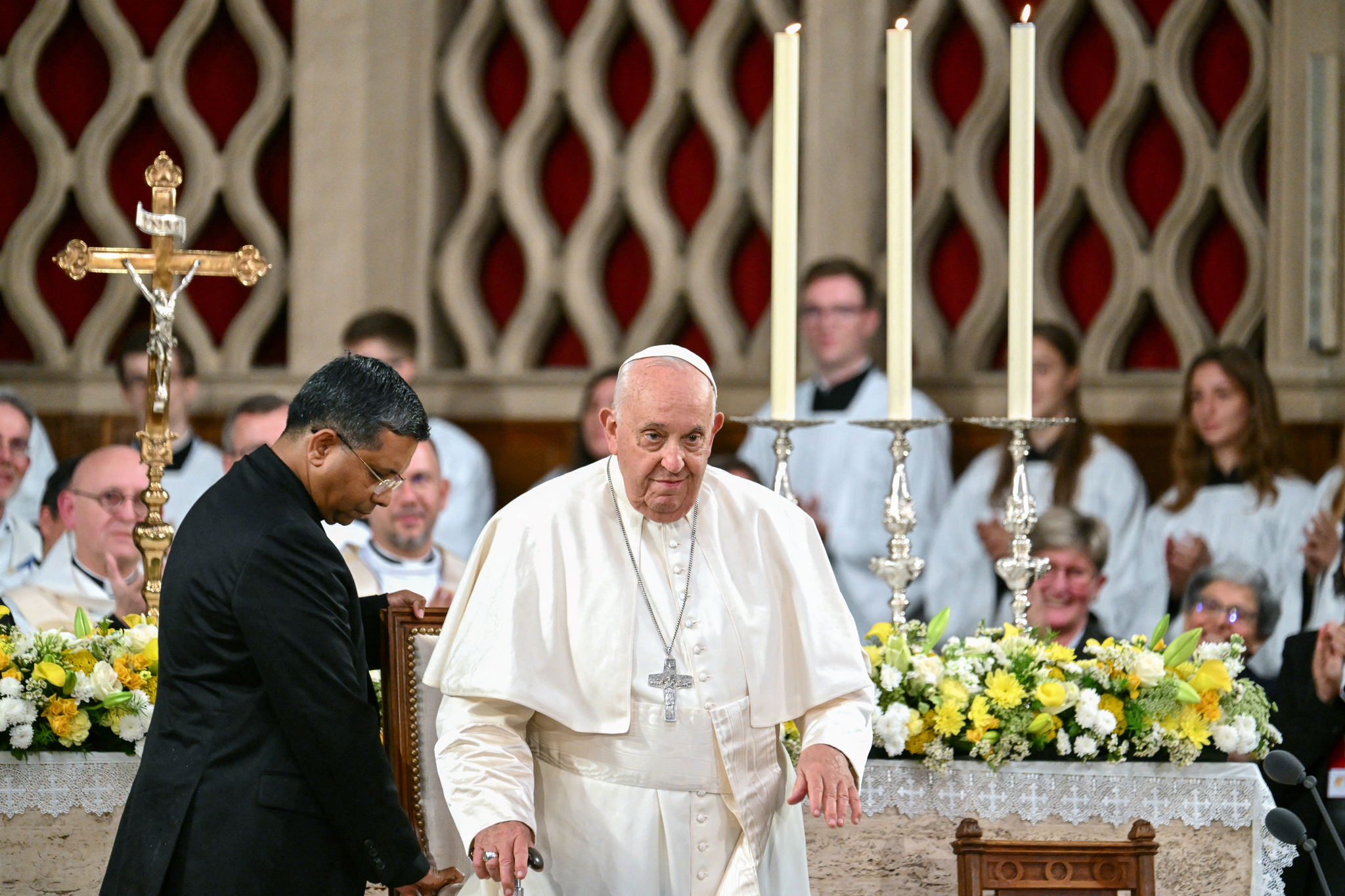 Pope Francis landed at Melsbroek military airport on Thursday evening as part of his four-day visit to Belgium. After a short delay due to bad weather, he was greeted by King Philippe and Queen Mathilde on the tarmac.