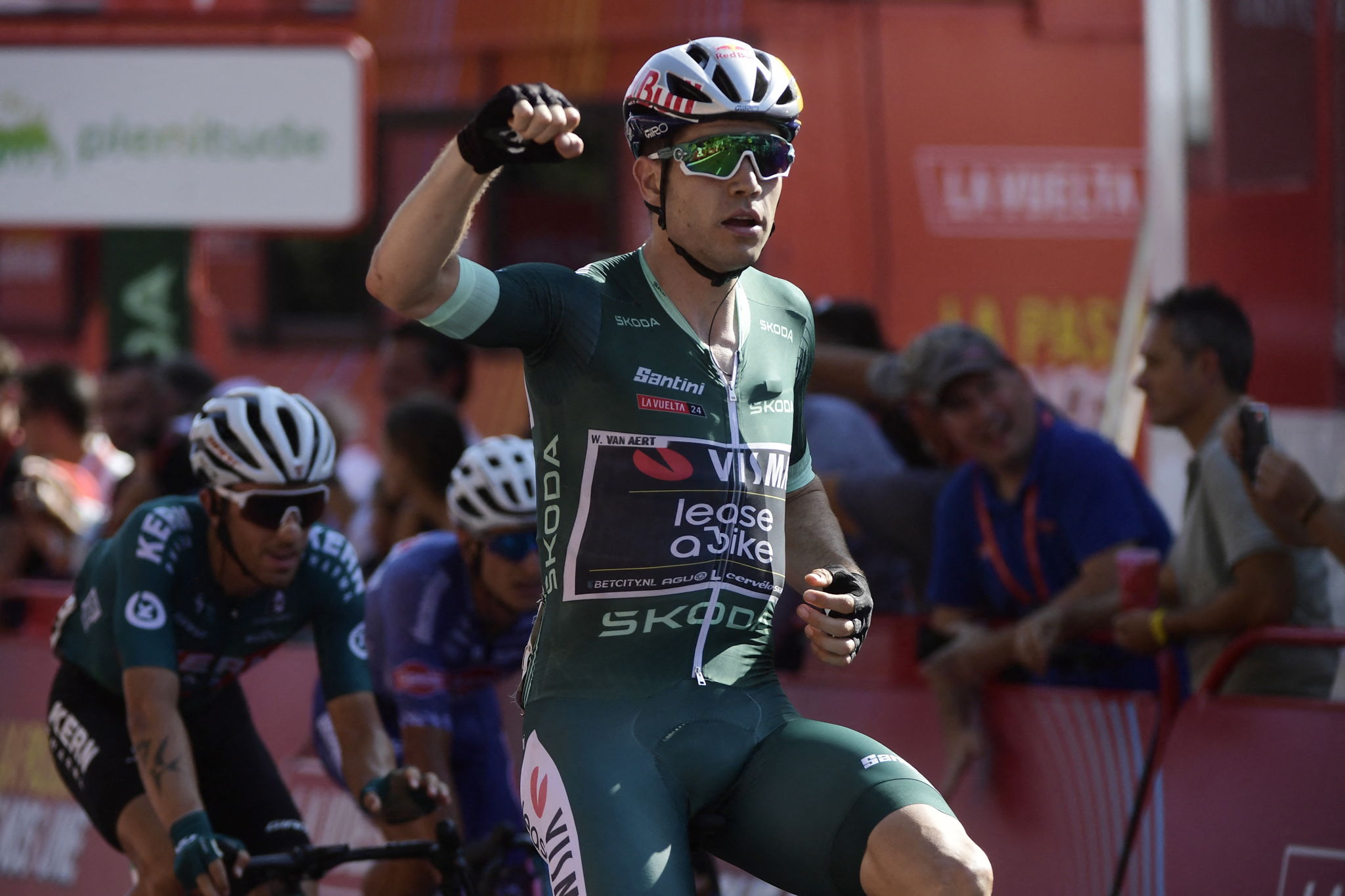 Wout van Aert (Visma-Lease a Bike) secured his third stage victory in the Vuelta a España on Tuesday, a moment made even more special by the presence of his wife Sarah and their children, Georges and Jerome, who were waiting for him at the finish line.